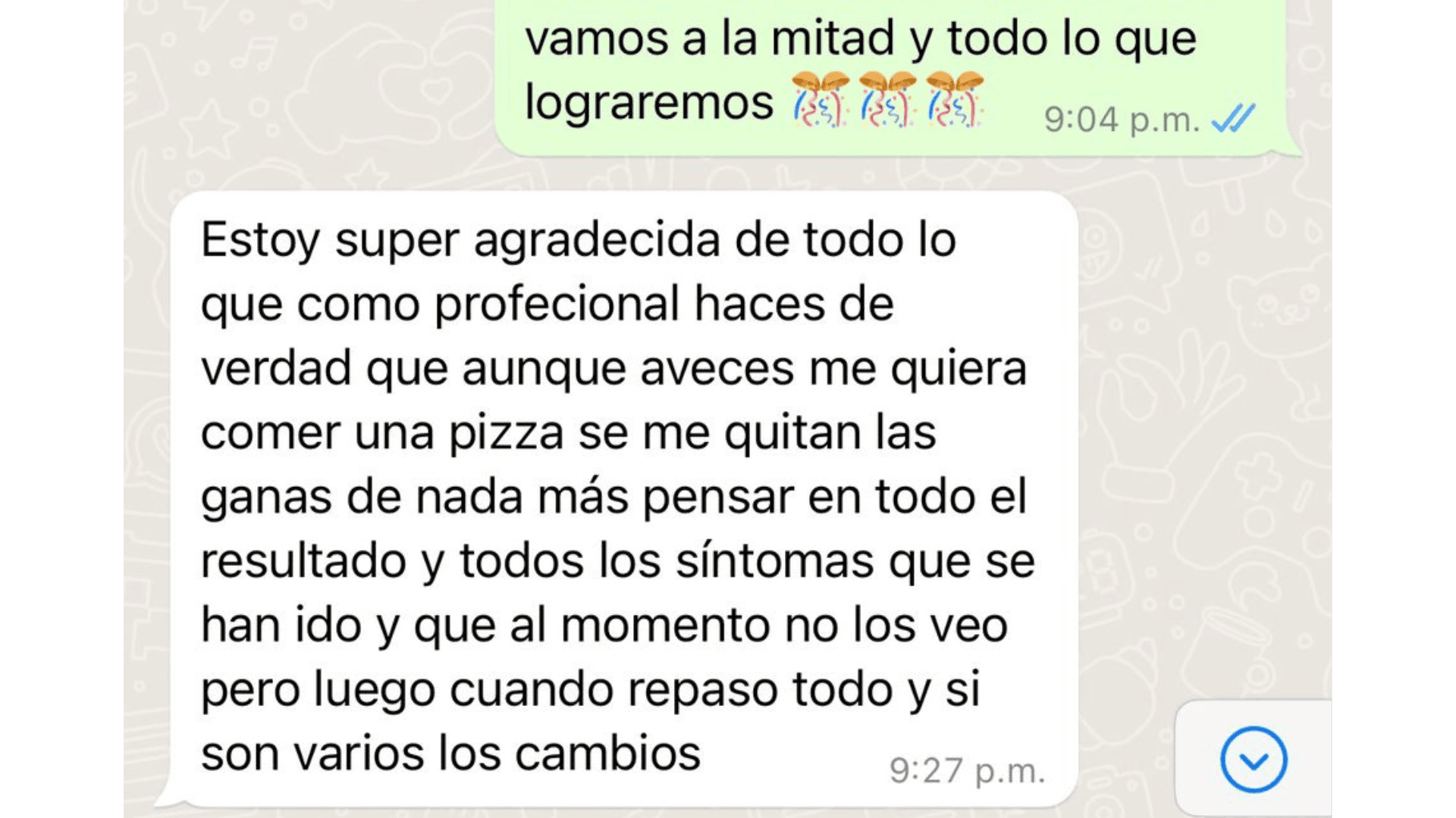 A través de mis programas y consultas he ayudado a que más personas puedan mejorar su relación con la comida y que puedan llevar una vida saludable, sin dietas restrictivas, ni miedo o culpa por lo que comen.